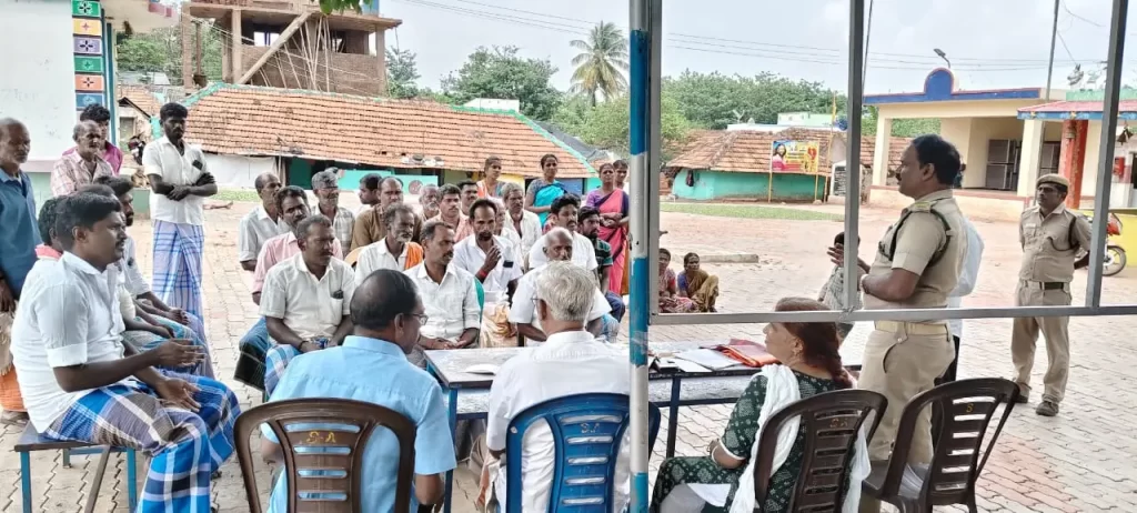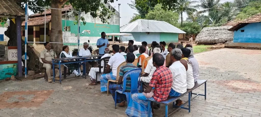 Tribal habitation area Jayangondam, Ariyalur district .As introductory address to the inhabitants the Managing Trustee, Director and other Volunteers of Foundation enquired and discussed about the present living situation of the Irulars inhabitants. This area was already visited by the Managing Trustee, Director and other volunteers of Foundation during 2012 when Managing Trustee was Chief Conservator of Forests Planning Officer & Director was Range Officer, in planning wing of Tamil Nadu Forest Department. As during 2012 the TamilNadu Forest Corporation staff evicted them from Thularamkurichi reserved forest area destroying their land crops, wells and huts.